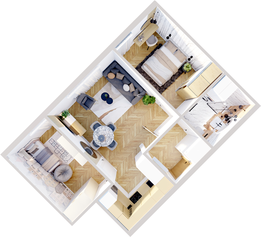 Mieszkanie jest sprzedawana w stanie deweloperskim, a poniższy spacer wirtualny prezentuje jak może wyglądać urządzone mieszkanie. Świadczymy też usługi wykończenia mieszkań pod klucz.