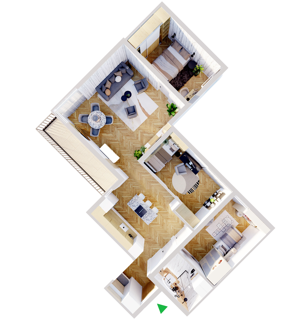Mieszkanie jest sprzedawana w stanie deweloperskim, a poniższy spacer wirtualny prezentuje jak może wyglądać urządzone mieszkanie. Świadczymy też usługi wykończenia mieszkań pod klucz.