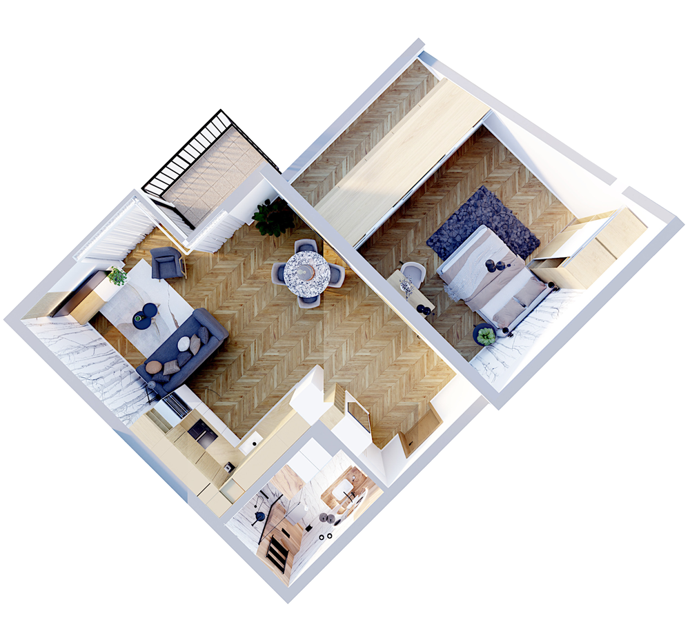 Mieszkanie jest sprzedawana w stanie deweloperskim, a poniższy spacer wirtualny prezentuje jak może wyglądać urządzone mieszkanie. Świadczymy też usługi wykończenia mieszkań pod klucz.