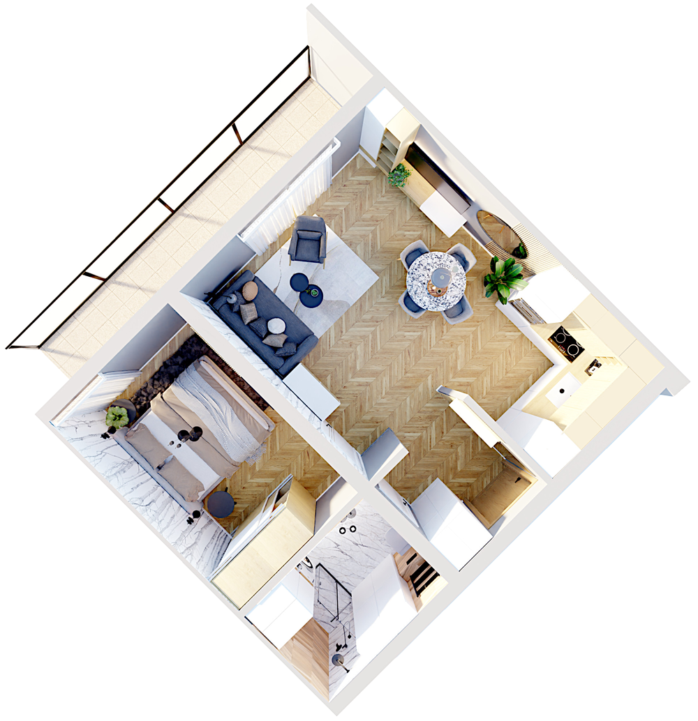 Mieszkanie jest sprzedawana w stanie deweloperskim, a poniższy spacer wirtualny prezentuje jak może wyglądać urządzone mieszkanie. Świadczymy też usługi wykończenia mieszkań pod klucz.