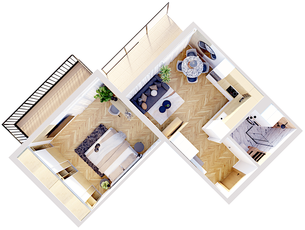 Mieszkanie jest sprzedawana w stanie deweloperskim, a poniższy spacer wirtualny prezentuje jak może wyglądać urządzone mieszkanie. Świadczymy też usługi wykończenia mieszkań pod klucz.