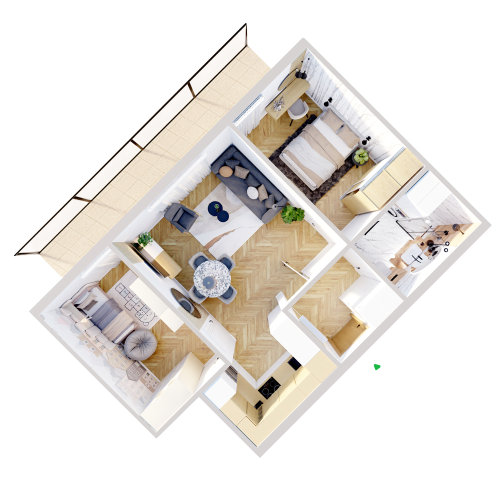 Mieszkanie jest sprzedawana w stanie deweloperskim, a poniższy spacer wirtualny prezentuje jak może wyglądać urządzone mieszkanie. Świadczymy też usługi wykończenia mieszkań pod klucz.